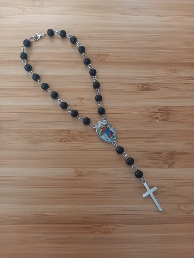 Růženec do auta se Svatým Kryštofem- patronem všech řidičů.