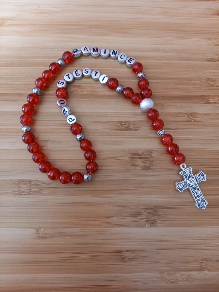 Červený růženec s nápisem