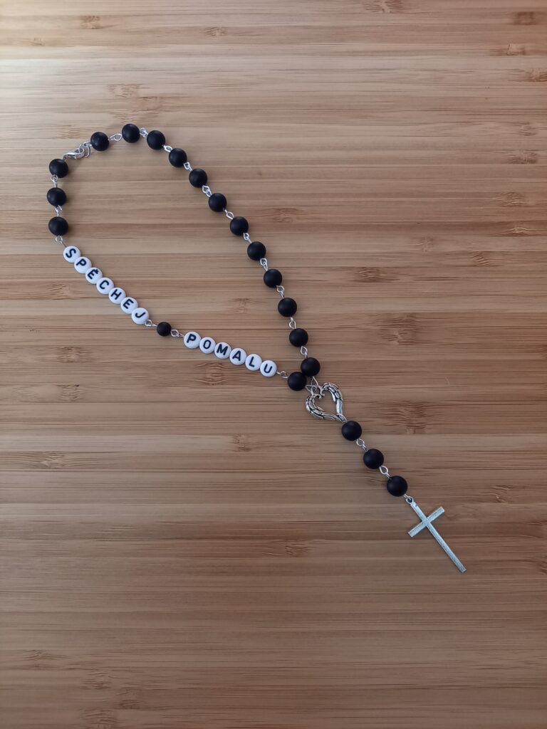 Růženec do auta ze skleněných korálků s nápisem.